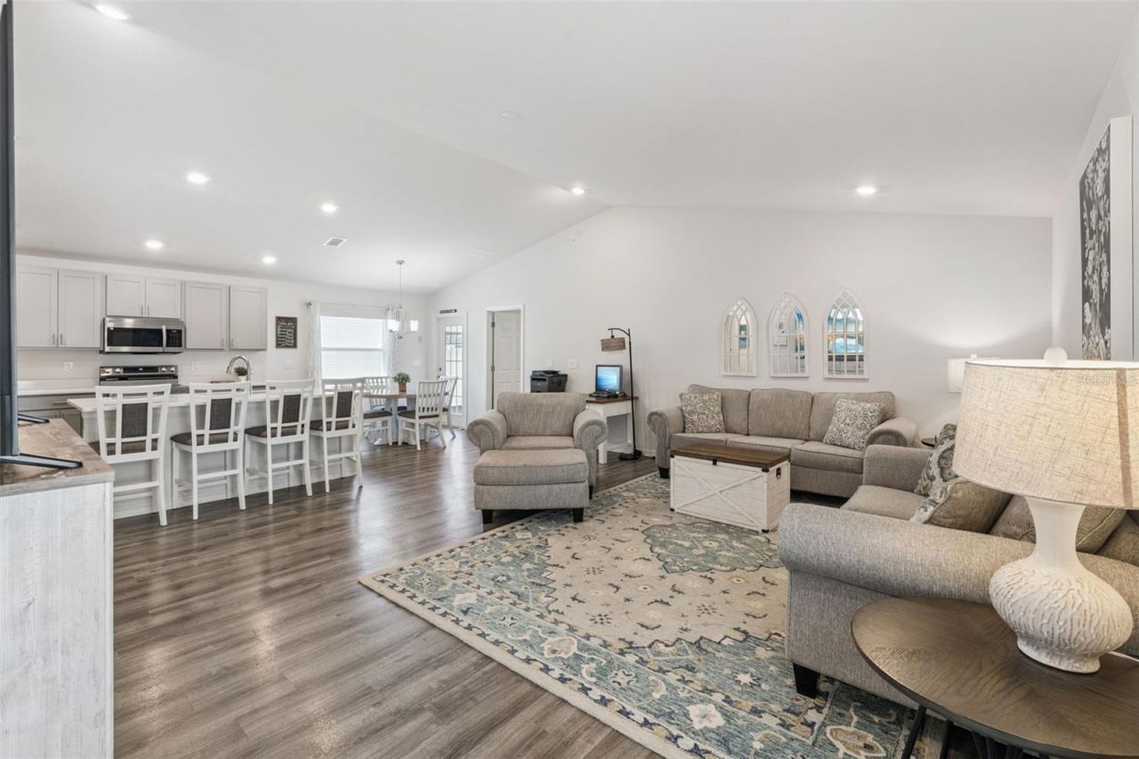 Move-in ready and nearly new, this beautifully maintained one-story home offers an inviting open floor plan designed for comfortable living and effortless entertaining. A quaint front porch welcomes you into a bright foyer that flows into a spacious living area highlighted by vaulted ceilings. The well-designed kitchen includes all appliances, a large island overlooking the living space, and a dining area with a glass door leading to a screened-in back patio and fully fenced yard, perfect for indoor-outdoor living. The thoughtfully designed split-bedroom layout places the primary suite at the rear of the home, complete with a large walk-in closet and an en suite bath with dual sinks, linen closet, and spacious tiled shower. Two additional bedrooms, full bath, and convenient laundry area are located between the kitchen and the two-car garage. Residents of Hammock Reserve enjoy access to multiple playgrounds, scenic walking trails, two dog parks, and a resort-style pool with shaded seating areas, all with easy access to 17-92 and State Road 27. Schedule your private showing today!