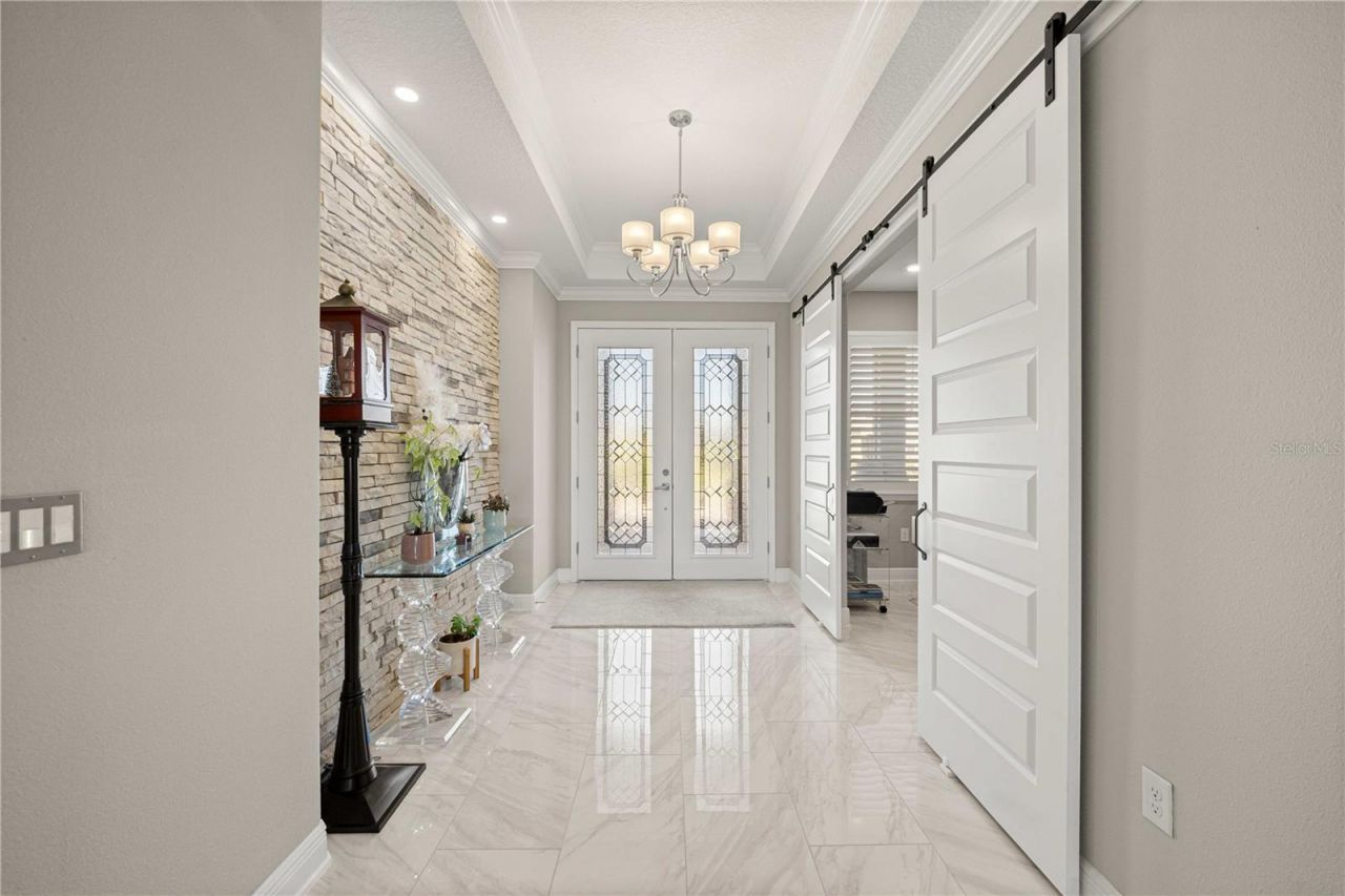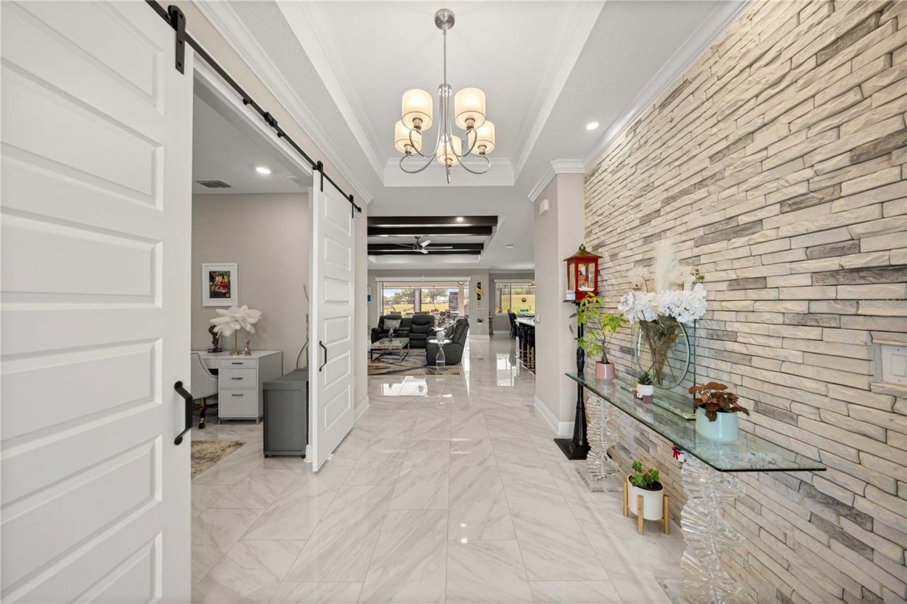 Exceptional golf course home located on the 5th hole of Candler Hills Golf Course, offering a rare opportunity as the only Aberdeen model currently available on the course. This thoughtfully upgraded residence features high-end finishes and custom design elements throughout.The outdoor living space is designed for both comfort and privacy, featuring an expanded lanai, built-in gas fireplace, custom bar area with pergola, ambient soffit lighting, and hurricane-rated remote screening, all within a domed birdcage enclosure with picture window screening overlooking the golf course.Inside, the home showcases numerous upgrades including custom cabinetry and built-ins throughout, shiplap designer accents, a brick feature wall in the foyer, barn doors, and crown molding throughout. The beamed tray ceiling in the family room adds architectural interest, while porcelain tile flooring throughout the home provides durability and style.The gourmet kitchen is equipped with GE Profile Caf? appliances, including a French door oven, along with a large composite sink, Level 6 Cambria countertops, and custom wood shelving in the pantry.Both primary suites feature professionally designed custom closet systems, complemented by Hunter Douglas window treatments, including plantation shutters throughout the home.Additional upgrades include a whole-house water filtration system, reverse osmosis system in the kitchen, tankless water heater, expanded driveway, and full gutter system.Enjoy resort-style living in one of Ocala's premier golf course communities.